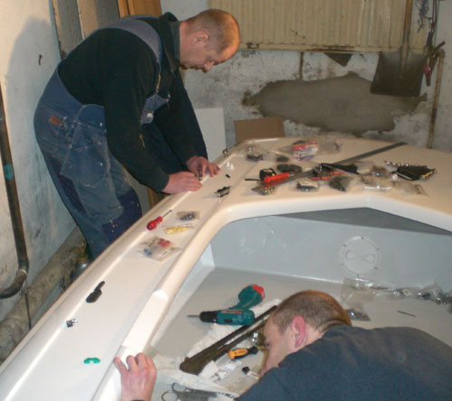 Brage Jansson och Anders Johnsson skruvar ihop en ny båt i ett garage i Mariehamn….