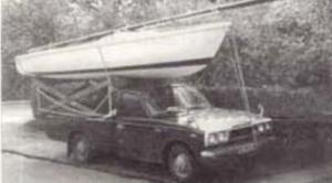 Har man ingen trailer får man lösa transporten på annat sätt. Bilden är från Danmark på 70-talet och bilen är en Datsun.